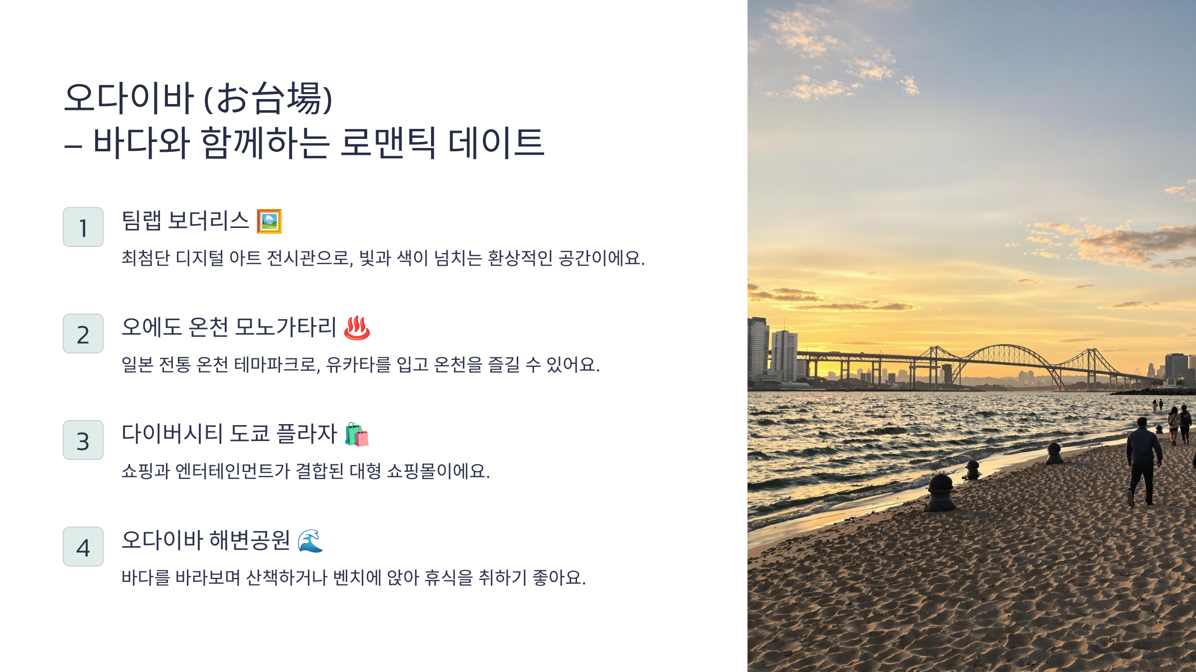 ### 🏖 오다이바에서 꼭 해봐야 할 데이트 코스