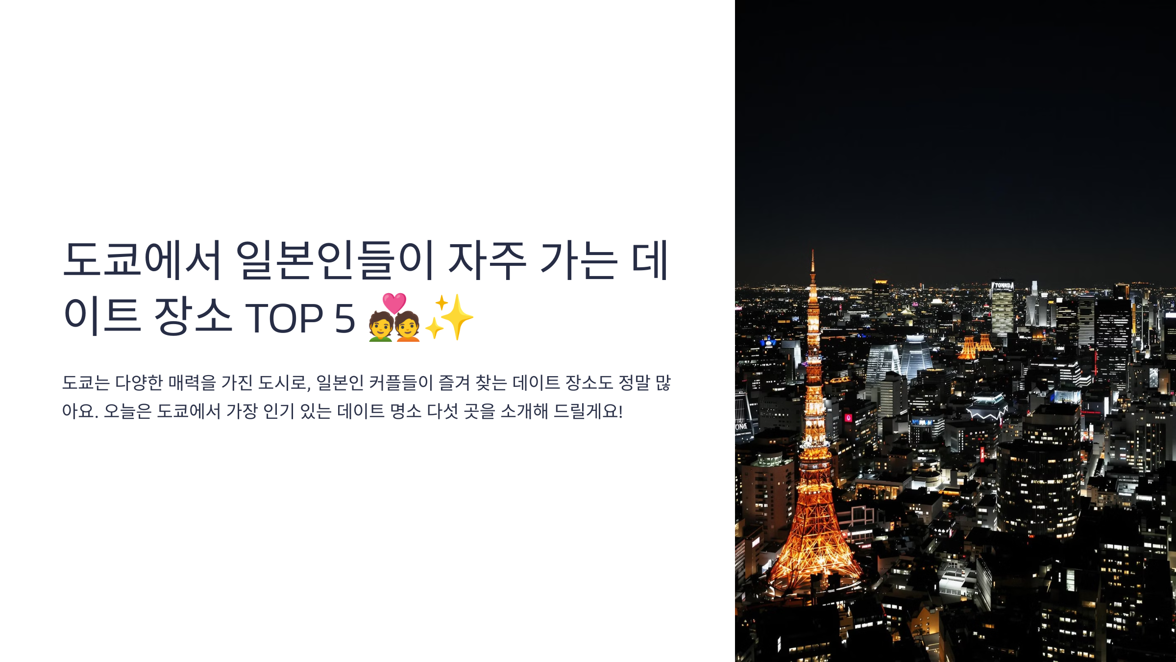 도쿄는 다양한 매력을 가진 도시로, 일본인 커플들이 즐겨 찾는 데이트 장소도 정말 많아요. 오늘은 도쿄에서 가장 인기 있는 데이트 명소 다섯 곳을 소개해 드릴게요! 로맨틱한 분위기를 원하는 커플부터 색다른 경험을 찾는 연인들까지 모두를 만족시킬 수 있는 핫스팟이랍니다.