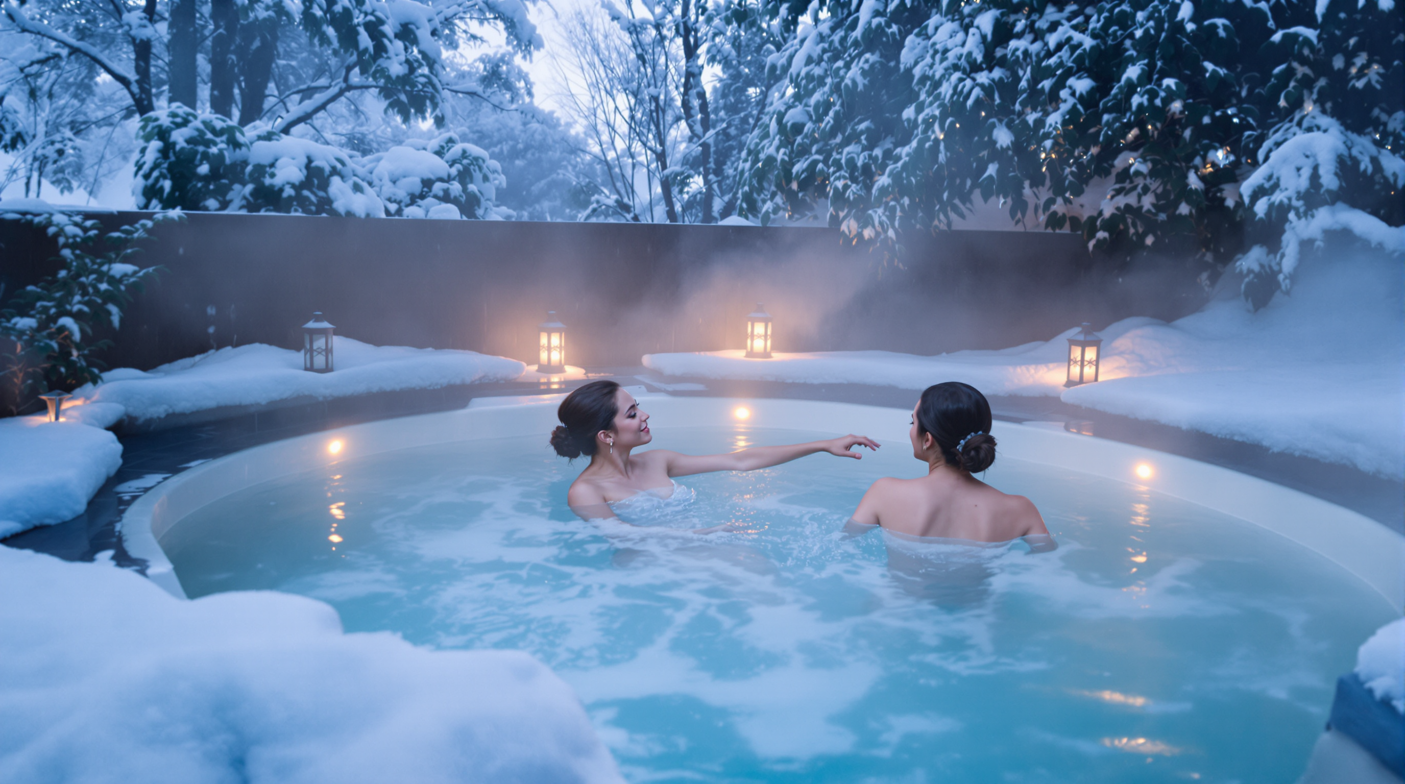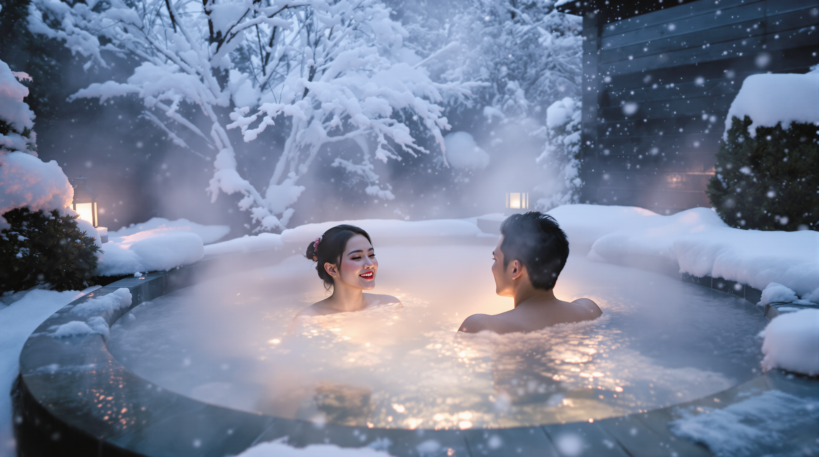 서로의 온기를 느끼며 조용한 온천 속에서 하루를 보내는 상상,
