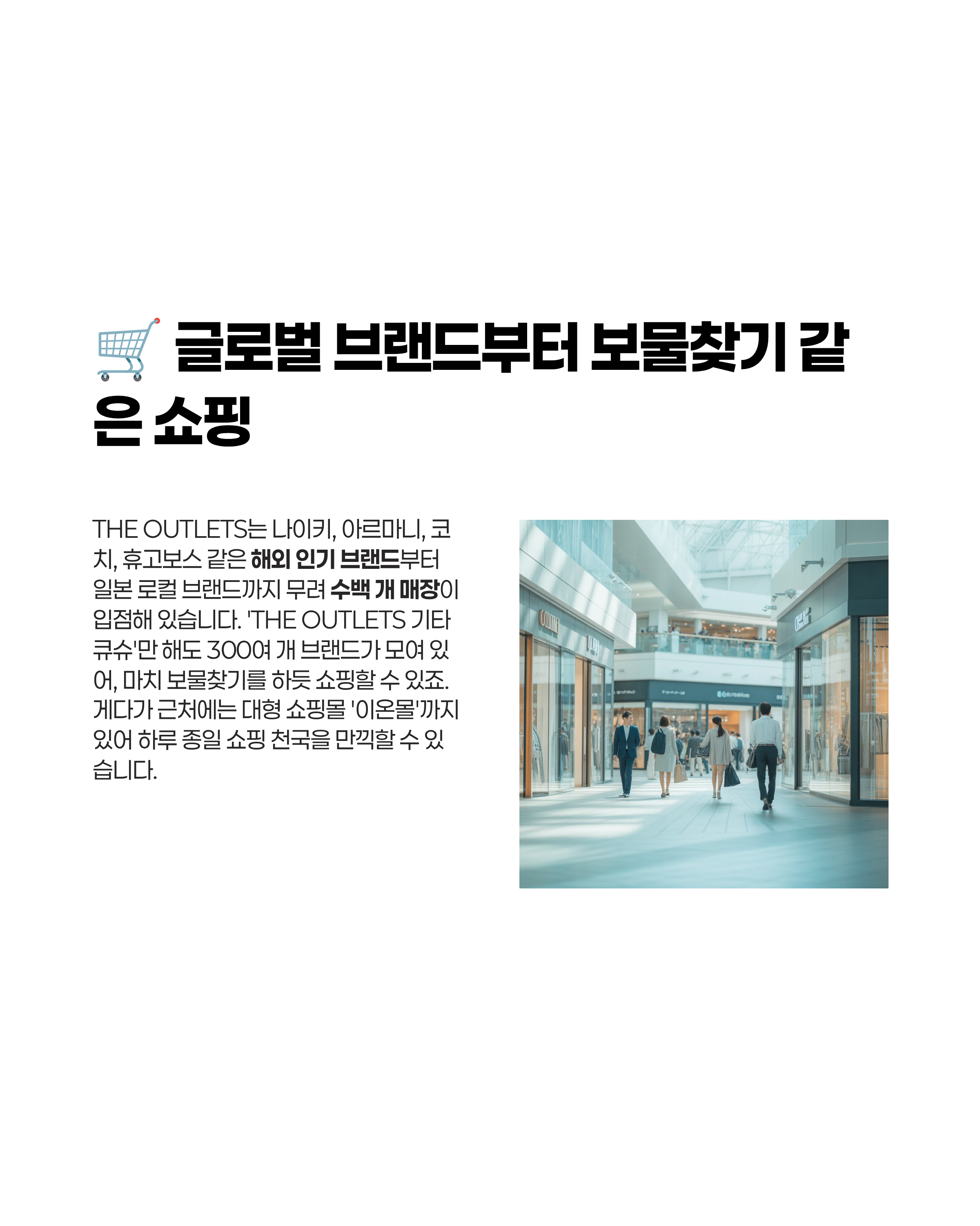 쇼핑, 맛집, 문화, 놀이까지 한 번에 즐길 수 있는 곳, THE OUTLETS. 일본 여행에서 하루쯤은 교외로 나가 이곳을 방문해 보시면 어떨까요? 단순한 아울렛을 넘어, 지역의 문화와 자연까지 담은 복합 관광지라서 오감이 모두 충족되는 경험을 선물해 줄 거예요. ✨