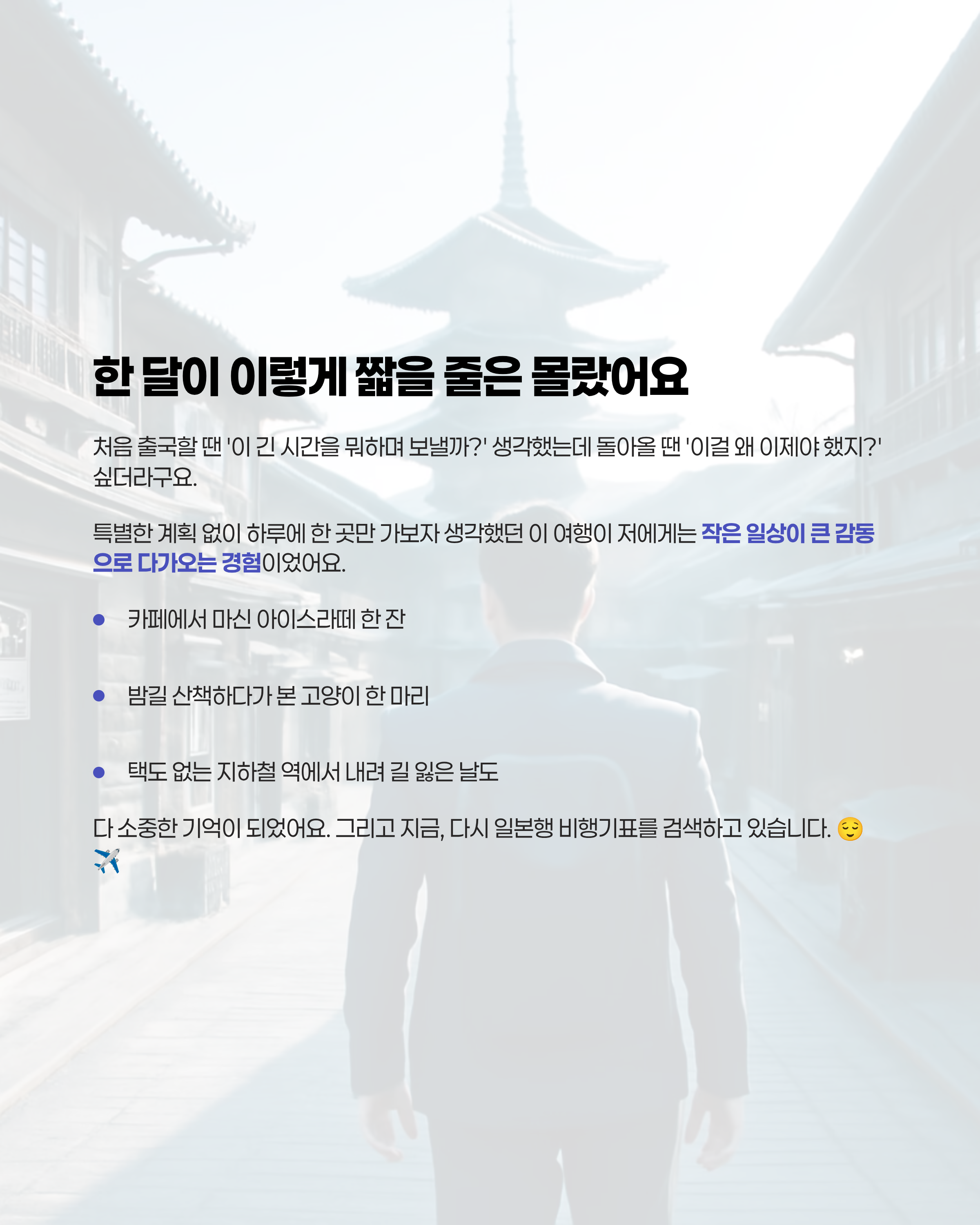 교토 골목길에서 헤매던 날도, 편의점에서 사 먹은 삼각김밥에 감동하던 순간도.