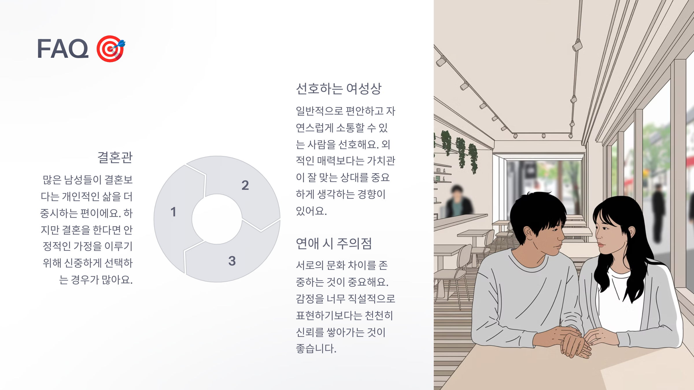 데이트 비용을 반반 부담하는 등 실용적인 연애 방식을 선호하는 남성들이 많아요. 또한 지나친 감정 소모를 피하고 편안한 관계를 유지하는 걸 중요하게 여깁니다.