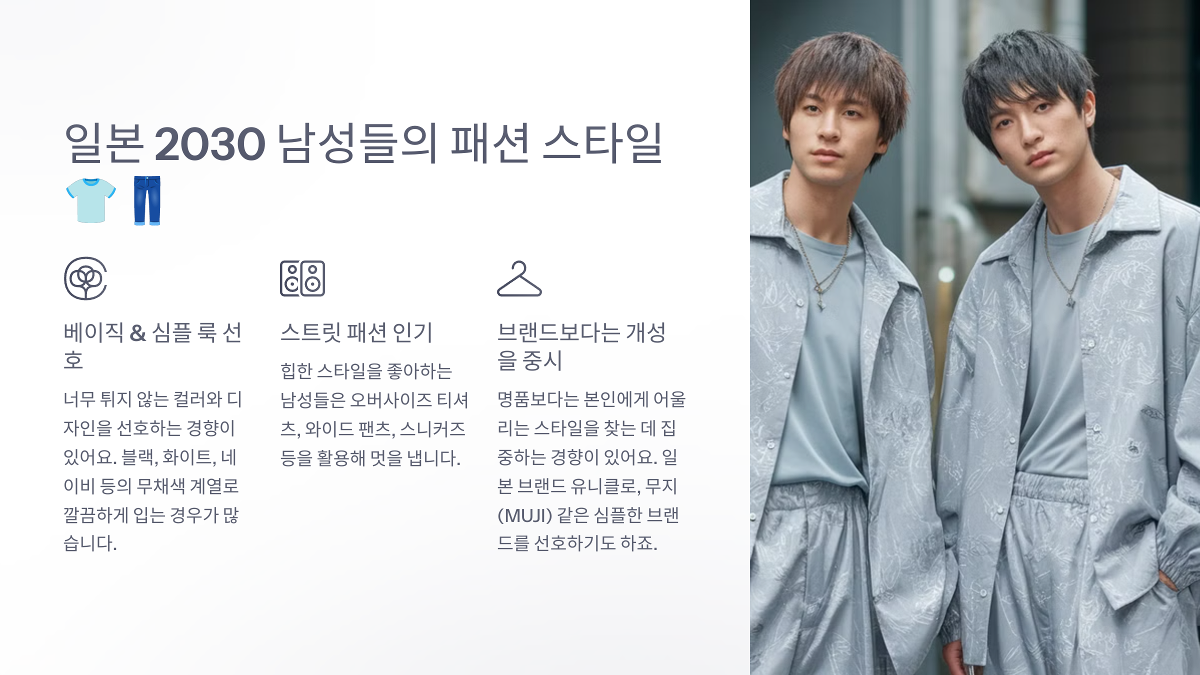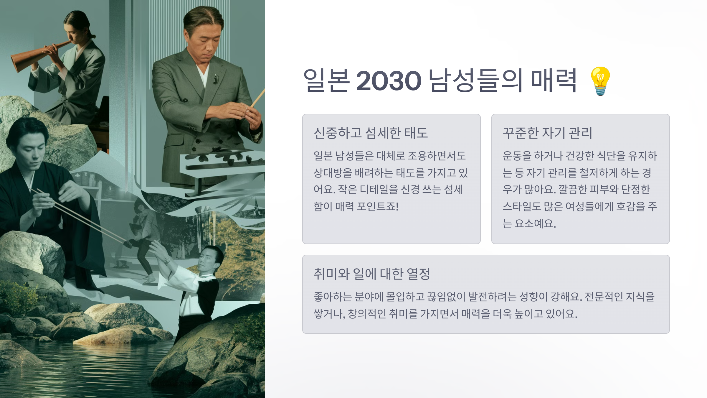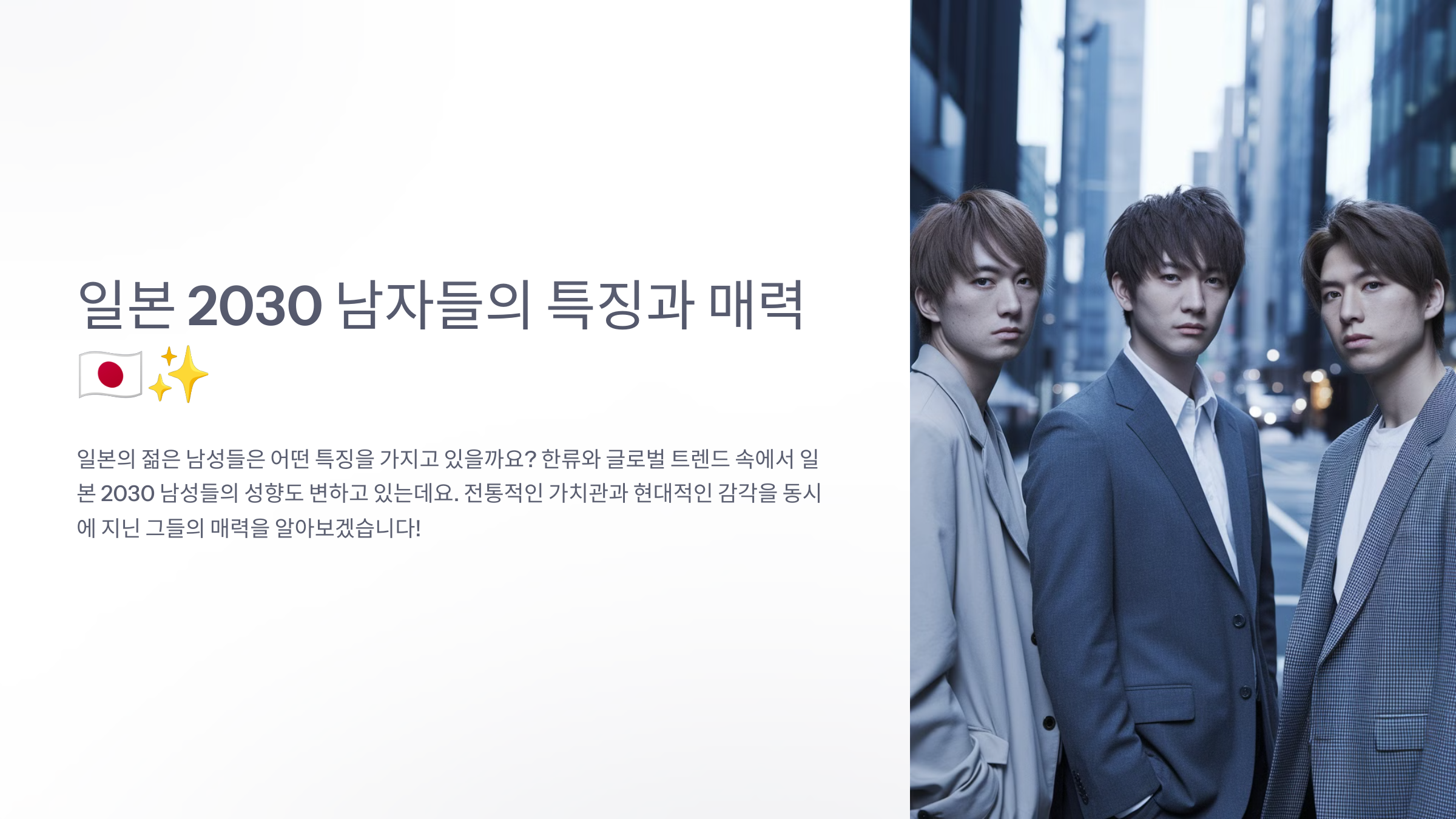 일본의 젊은 남성들은 어떤 특징을 가지고 있을까요? 한류와 글로벌 트렌드 속에서 일본 2030 남성들의 성향도 변하고 있는데요. 전통적인 가치관과 현대적인 감각을 동시에 지닌 그들의 매력을 알아보겠습니다!