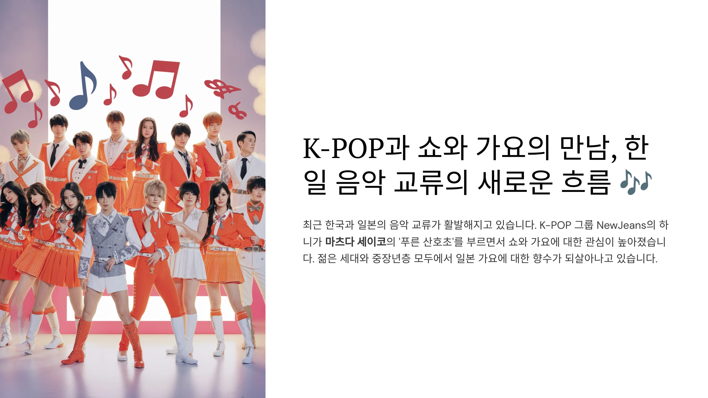 여러분은 쇼와 가요와 K-POP의 만남에 대해 어떻게 생각하시나요? 혹시 좋아하는 일본 가요가 있다면 공유해 주세요! 😊🎶