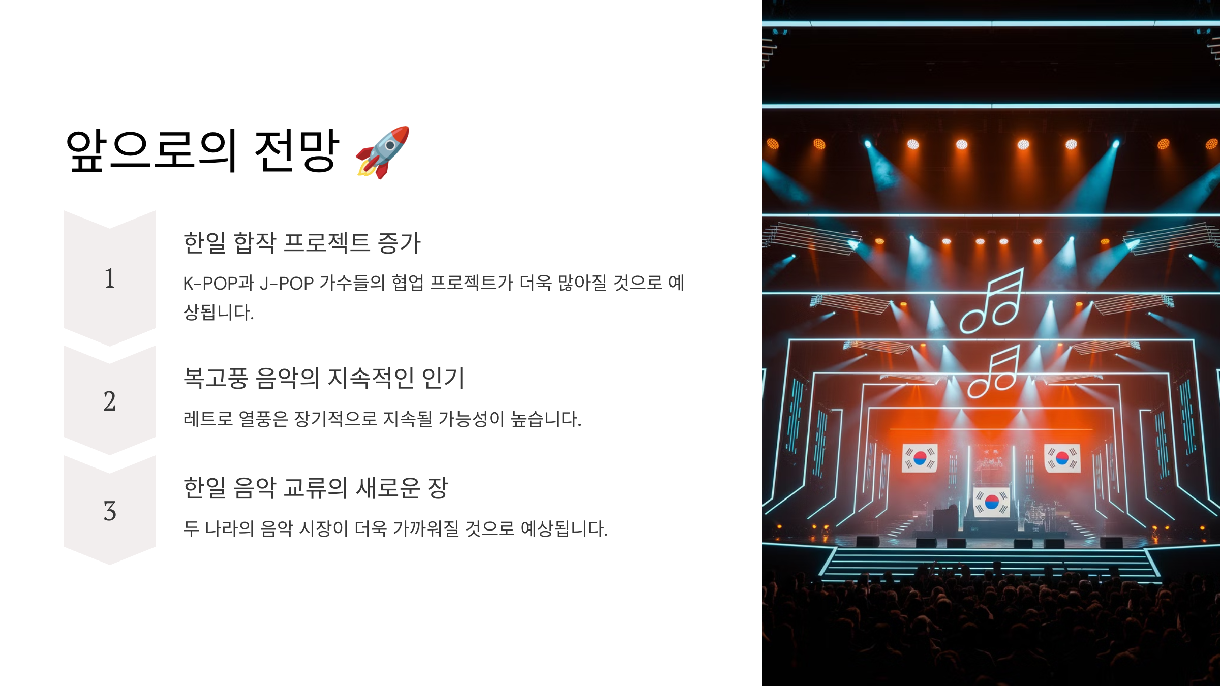 레트로 열풍은 단기적인 트렌드가 아니라 장기적으로 지속될 가능성이 높습니다. 이에 따라 쇼와 가요뿐만 아니라 90년대, 2000년대 J-POP도 다시 주목받을 가능성이 큽니다.