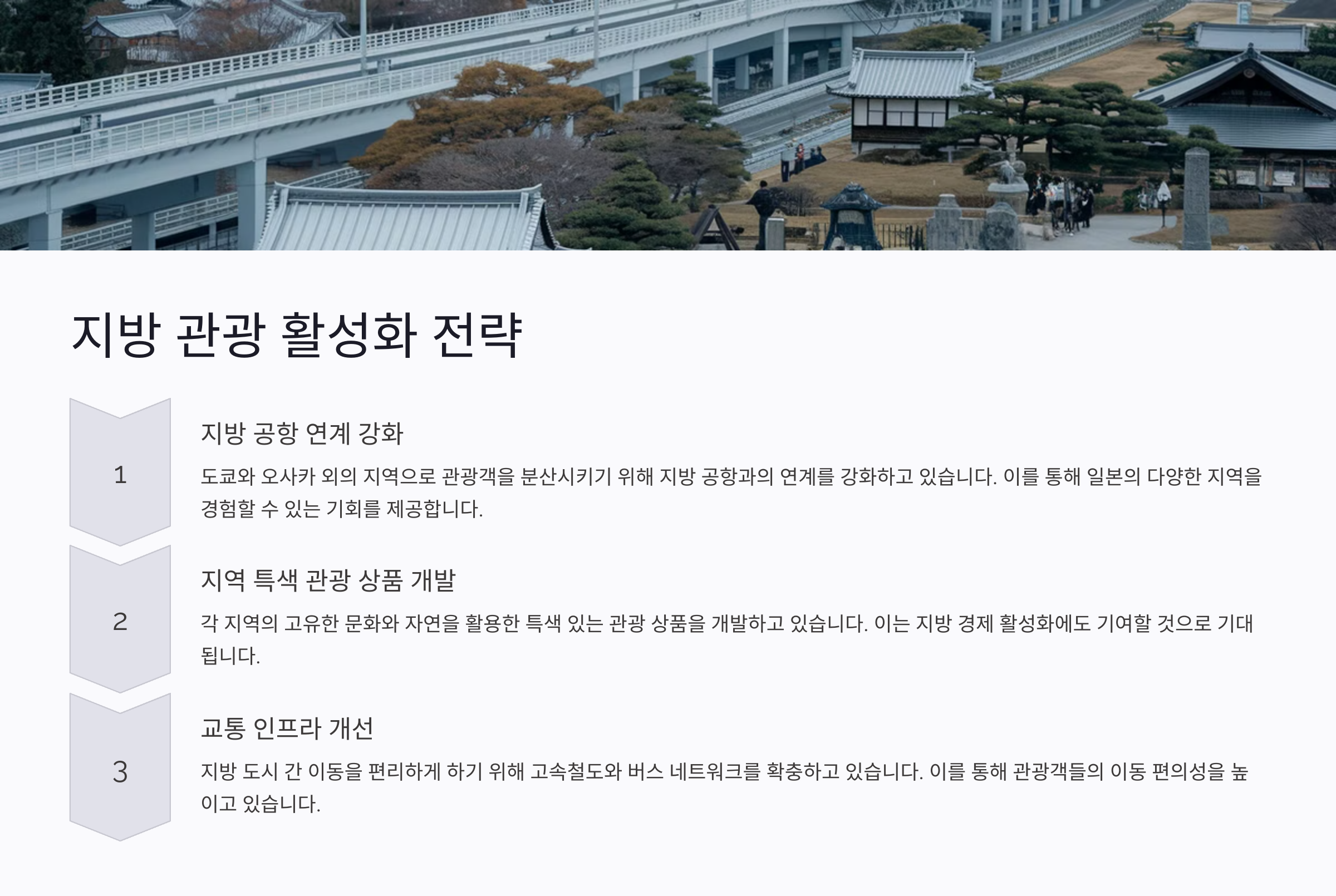 - 이에 따라 일본 정부는 관광객 분산 정책을 도입하고 있으며, 지방 관광 활성화를 적극 추진 중입니다.