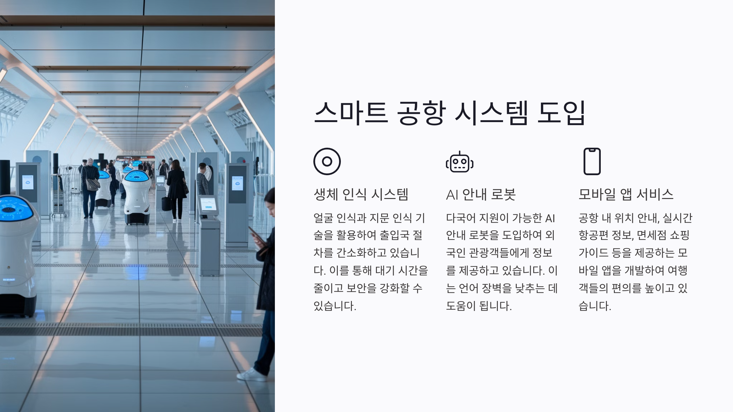 - 무인 수속 시스템 및 AI 기반 출입국 심사 등 스마트 공항 시스템이 확대되고 있습니다.