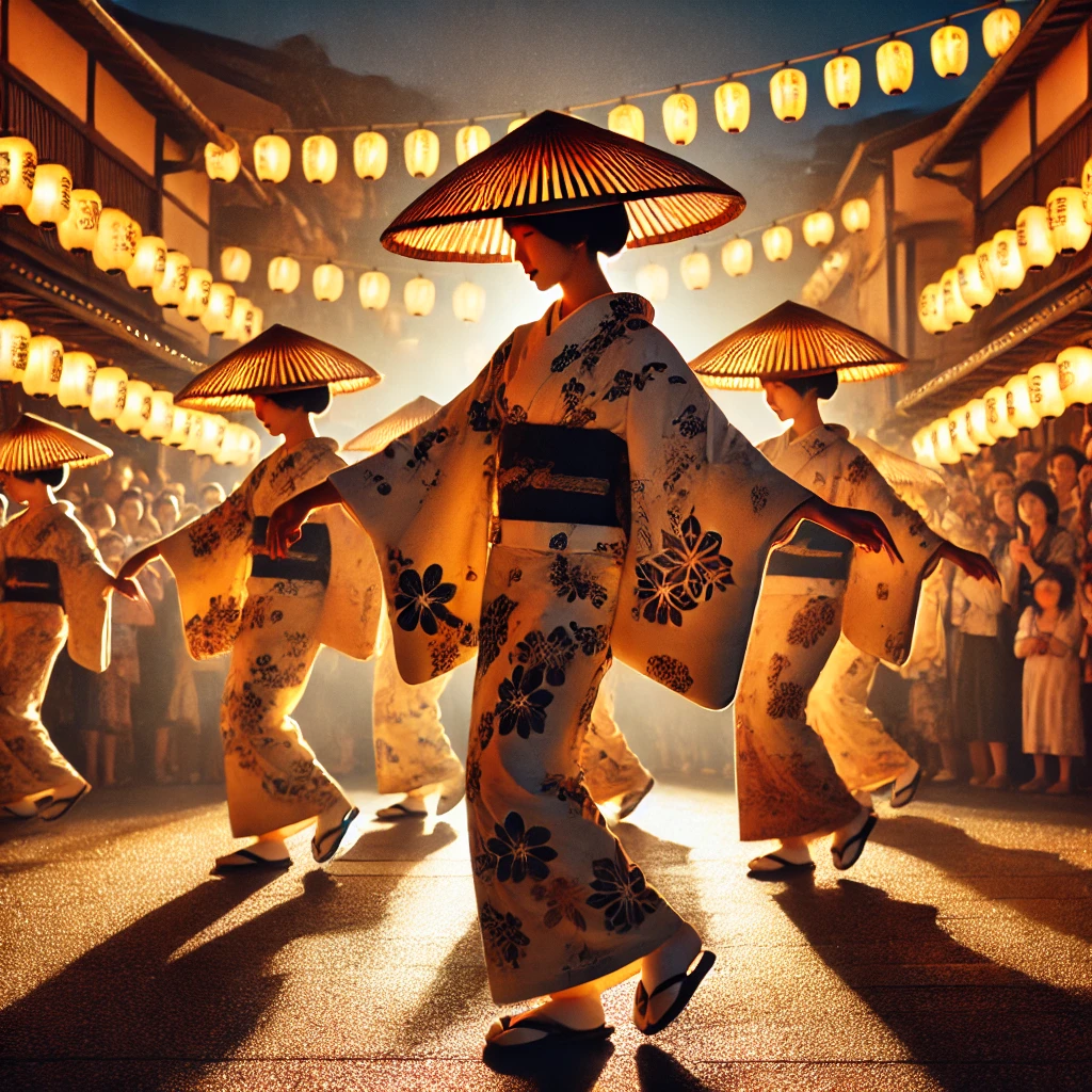 유카타를 입은 무용수들이 얼굴을 가리는 삿갓을 쓰고, 샤미센(전통 현악기)과 다이코(일본 북)의 연주에 맞춰