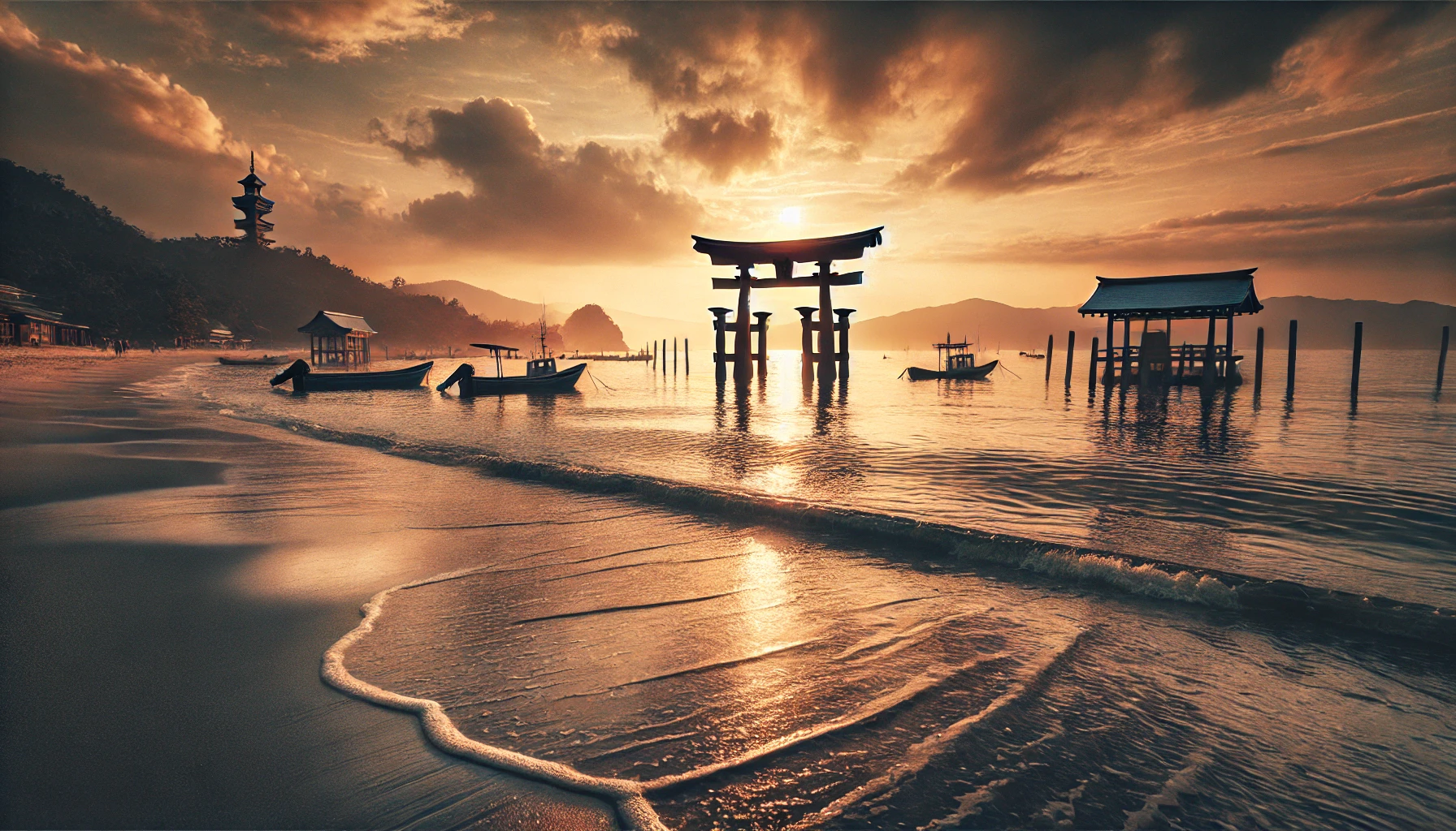 • 바다 위에 서 있는 신비로운 후타미가우라 도리이(神社の鳥居)에서 황홀한 석양 감상